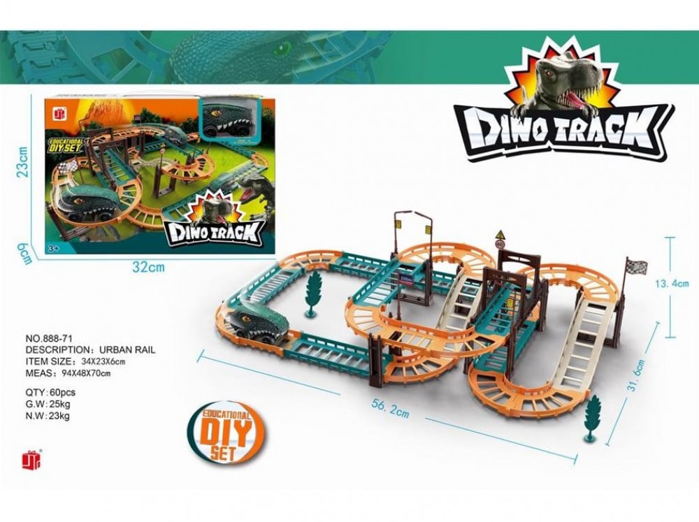 سكة سيارات الديناصورات , تتميز السكة بمسار يحتوي علة منعطفات مختلفة الزوايا و ارتفاعات و انحدارات مختلفة تعطي طفلك متعة اكبر وقت اللعب , تحتوي على سيارات على شكل ديناصورات حيث تجمع اللعبة بين السيارات و الديناصورات في لعبة واحده.
