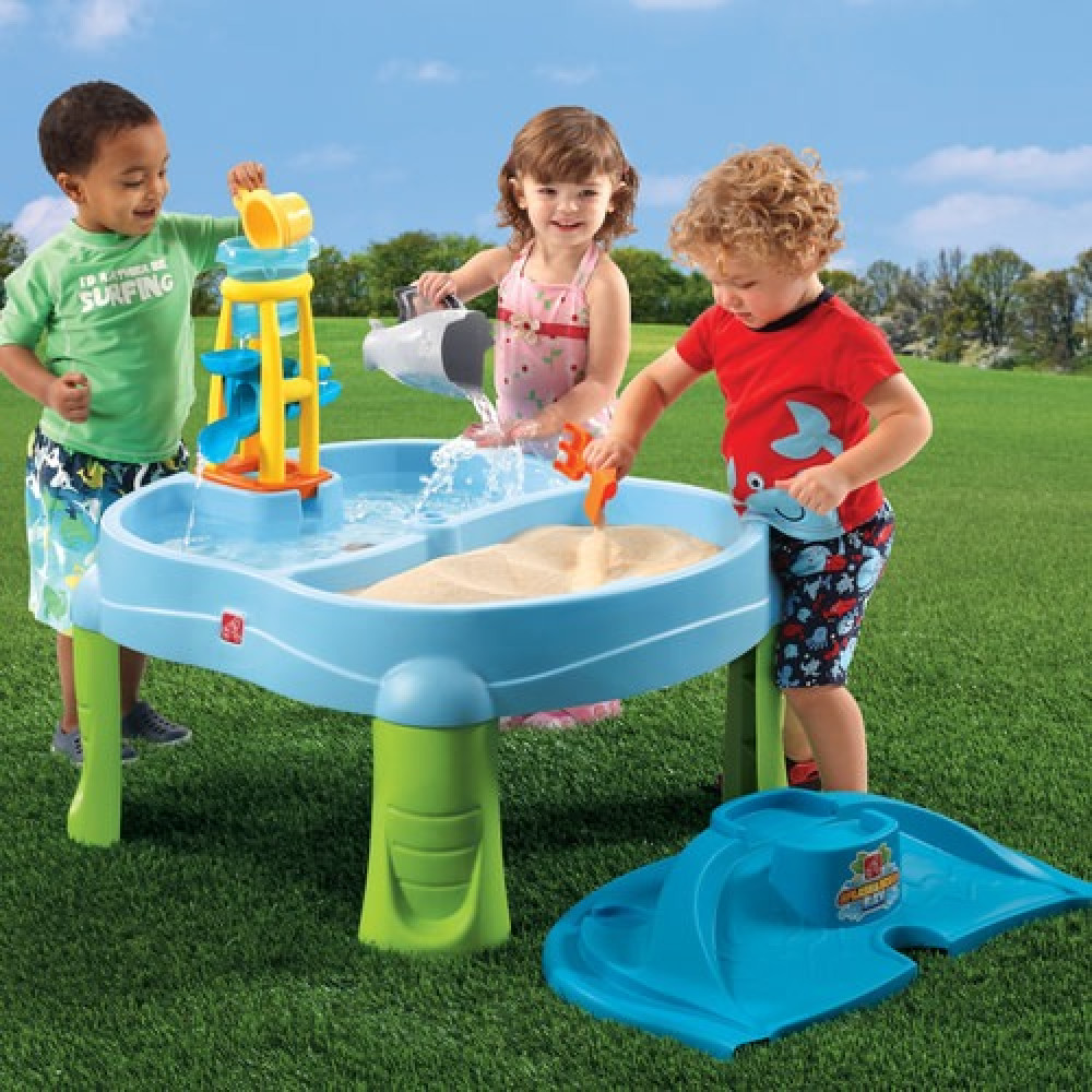 - مجموعة ملحقات مكونة من 7 قطع تشمل برج مياه وكوب قابل للإزالة وزلاجة وعجلة دوارة ومغرفة سمك القرش وكوب ومجرفة أو مجرفة
