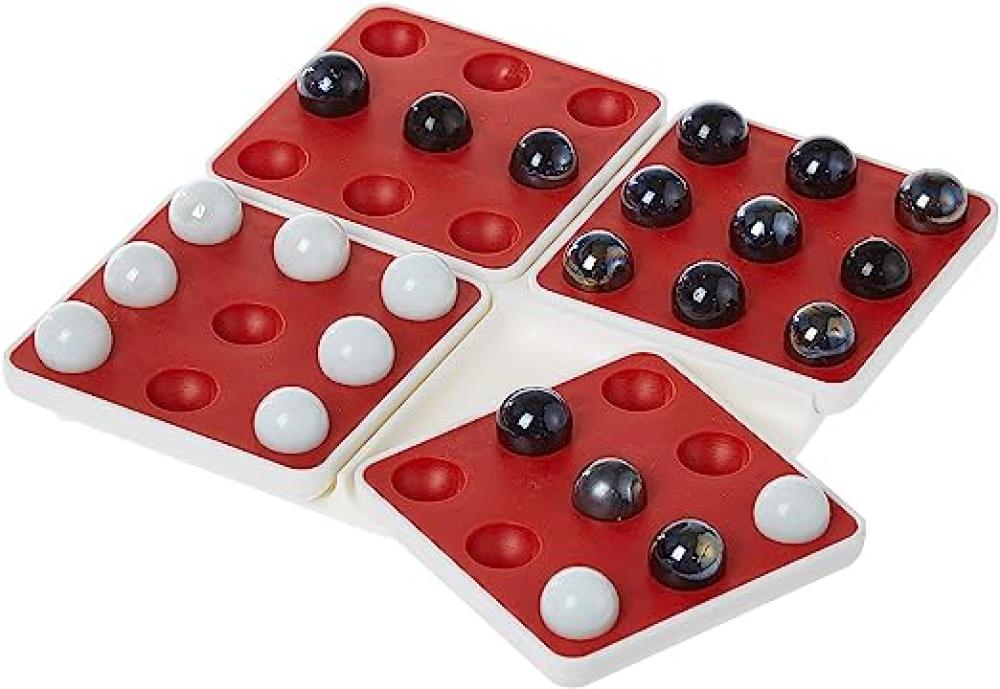 اللعبة عبارة عن لوحة اللعب الرئيسية مقسمة إلى أربع لوحات صغيرة وكل لوحة تحتوي على 9 أماكن لوضع الكرات.36 كرة مقسمة بين اللون الابيض والاسود.بالإضافة لكتالوج لشرح قواعد اللعبة.