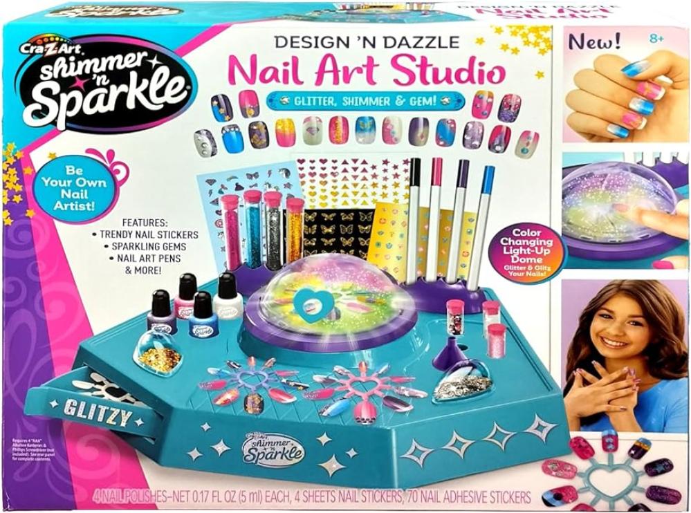 - تتضمن: ستوديو إبداع فن الأظافر، قبة لامعة متغيرة اللون، تشكيلة من طلاء الأظافر، تشكيلة من الجليتر، تشكيلة من الترتر، حلقات أظافر مع مواد لاصقة، قلم تحديد فن الأظافر، تشكيلة من ملصقات وأحجار كريمة.