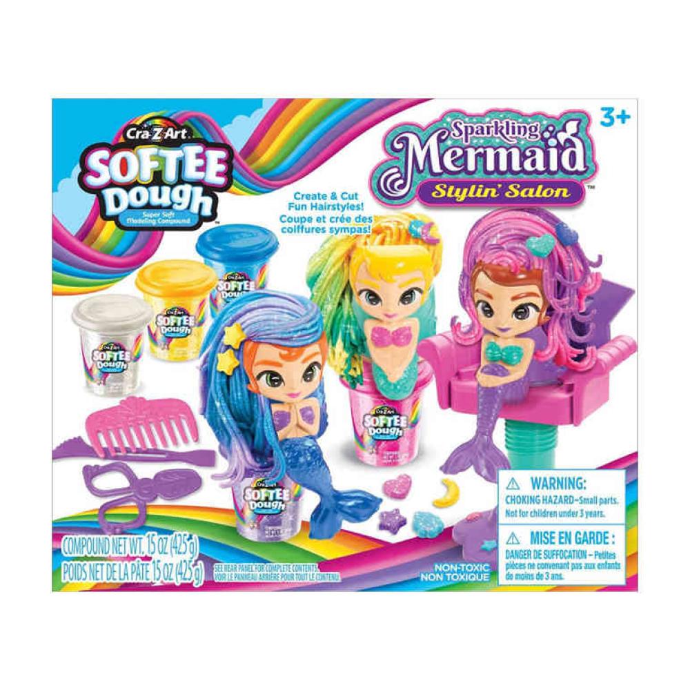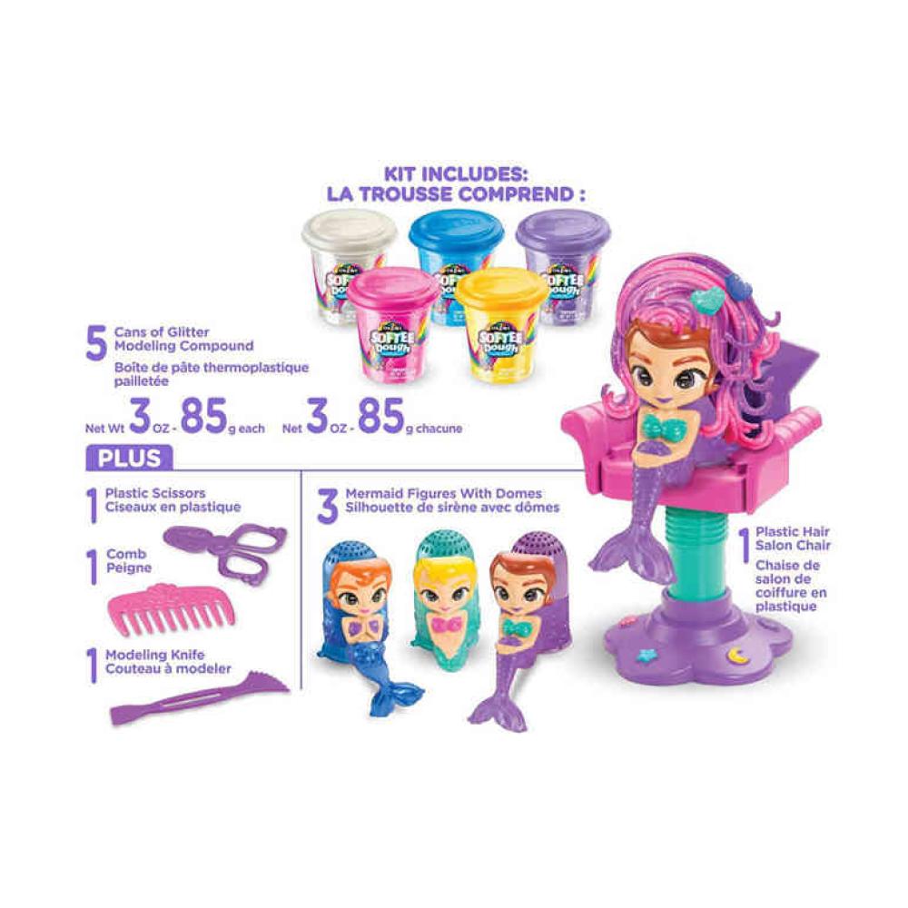 هناك ثلاثة ألوان لامعة لعجينة اللعب: الوردي والفضي والأزرق ، بالإضافة إلى وعاء واحد من عجينة اللعب الصفراء. تم تضمين 2 تمثال حورية البحر ، 1 كرسي صالون تصفيف الشعر ، 1 مقص بلاستيكي ، 1 مشط ، 1 سكين النمذجة في المجموعة أيضا. عجينة Softee محبوبة من قبل