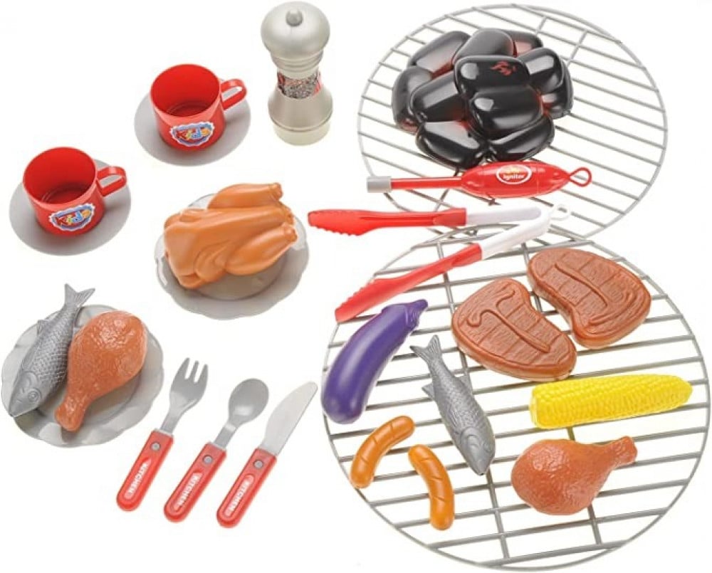 إنها مجموعة كاملة ... مع شواية وصفيحة شواء ، لها غطاء يمكنك تحريكها على عجلتين مثل مجموعة الشواء الحقيقية. لجعلها أكثر جاذبية ، تضيء هذه المجموعة وتصدر صوتًا مثل الشواء الحقيقي. مع أدوات الطهي و الملحقات الاخرى