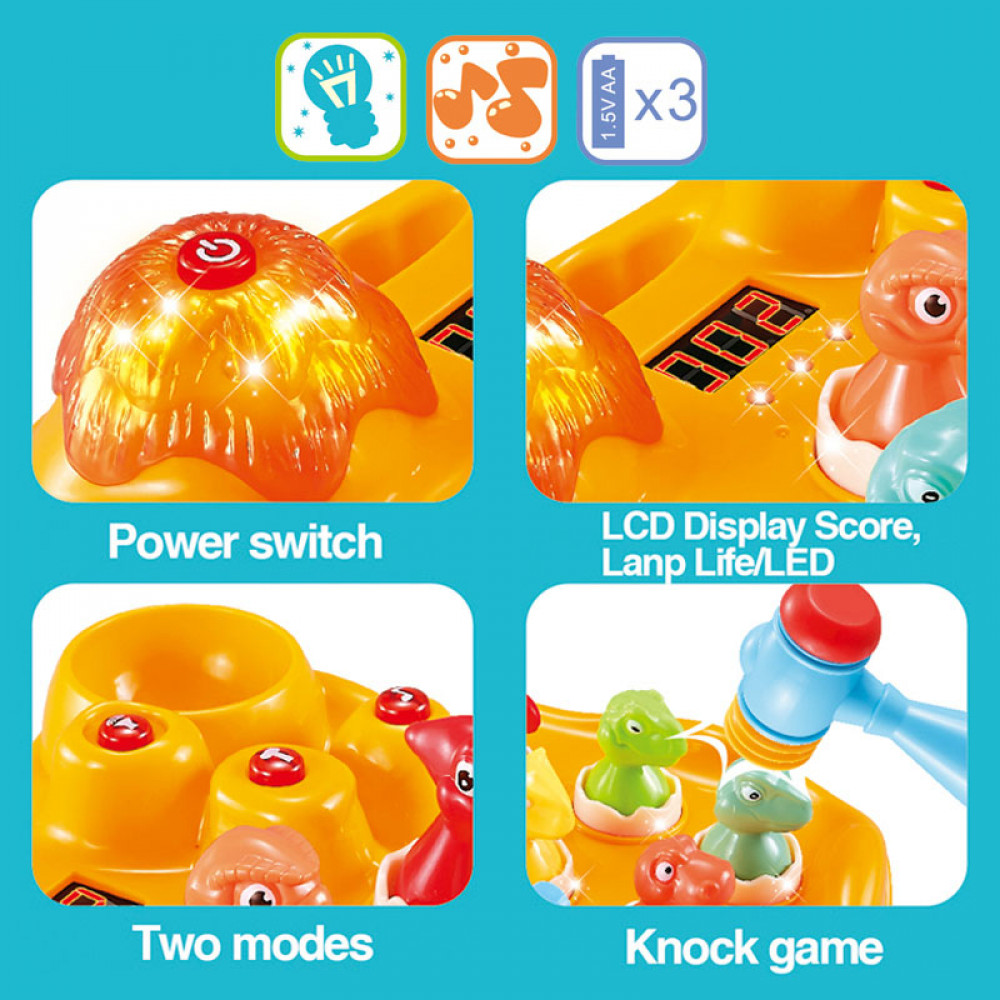 - من السهل جدًا لعب لعبة الضرب هذه. عندما تبدأ اللعبة، تضيء الديناصورات للإشارة إلى أنها جاهزة للضرب ويجب على اللاعبين إعطاء الديناصورات ضربة جيدة للتسجيل. تضيء الديناصورات بشكل معتدل بحيث يسهل ملاحظة الأطفال ويمكنهم جذب الانتباه والتفاعل بسرعة. بالإضافة إلى ذلك، يوجد زر للتحكم في مستوى الصوت يمكن للأطفال التحكم فيه.