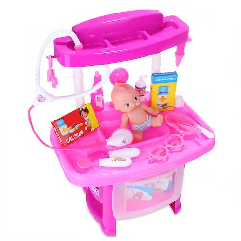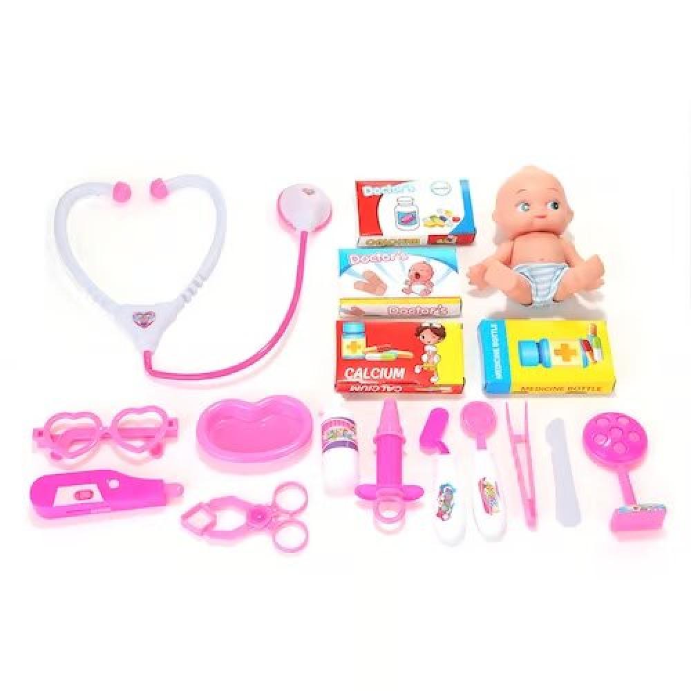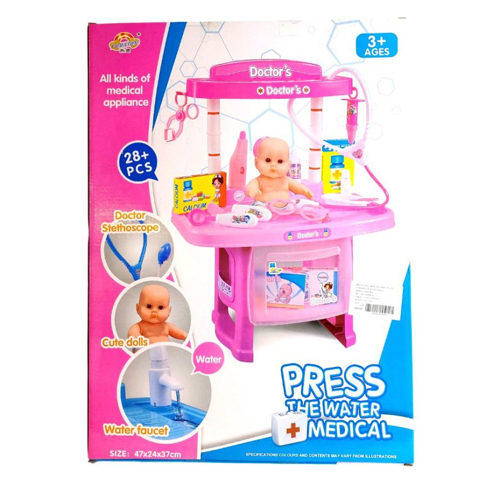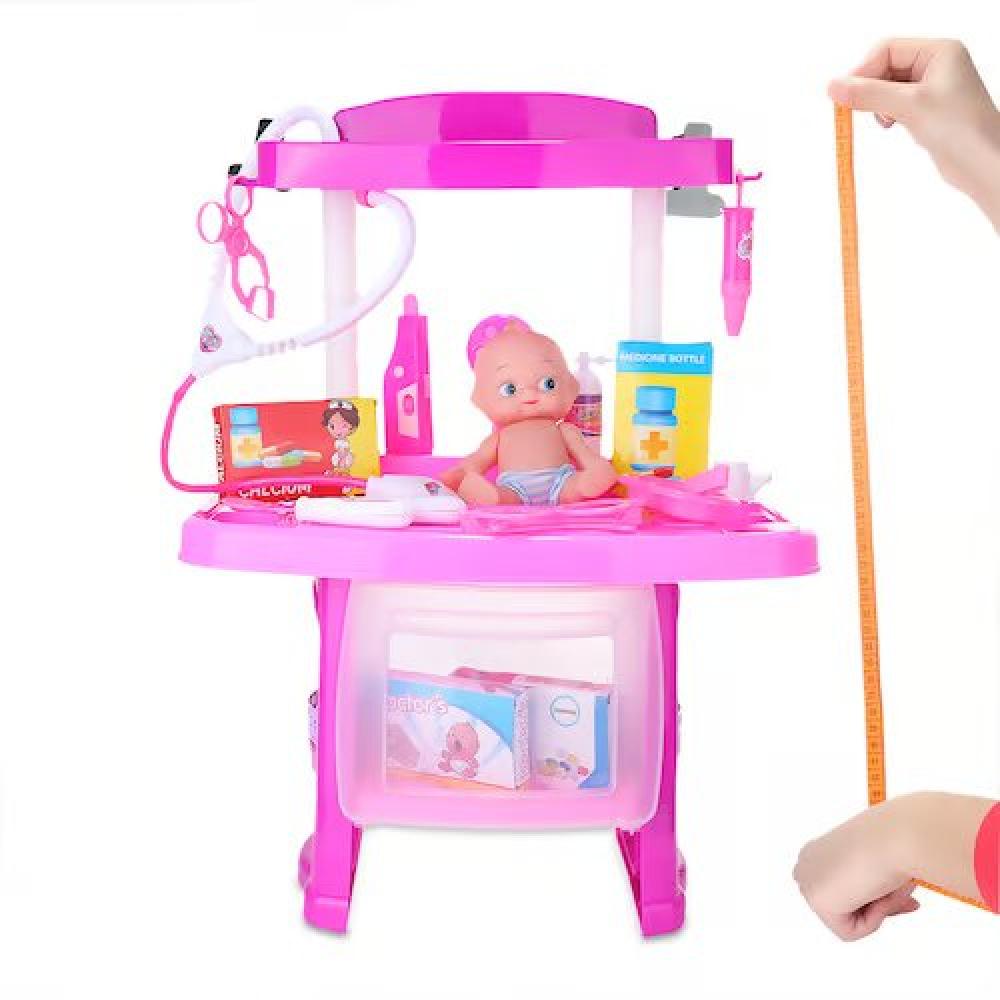 عدة الطبيب مع طاولة العلاج مع دمية لعبة تعليمية ممتعة مصممة لتنشيط خيال طفلك وتعريفه على ادوات الطبيب و اجزاء جسم الانسان مكونة من 28 قطعة مختلفة لجعل اللعب أكثر متعة و واقعية مناسب للاطفال +3 سنوات